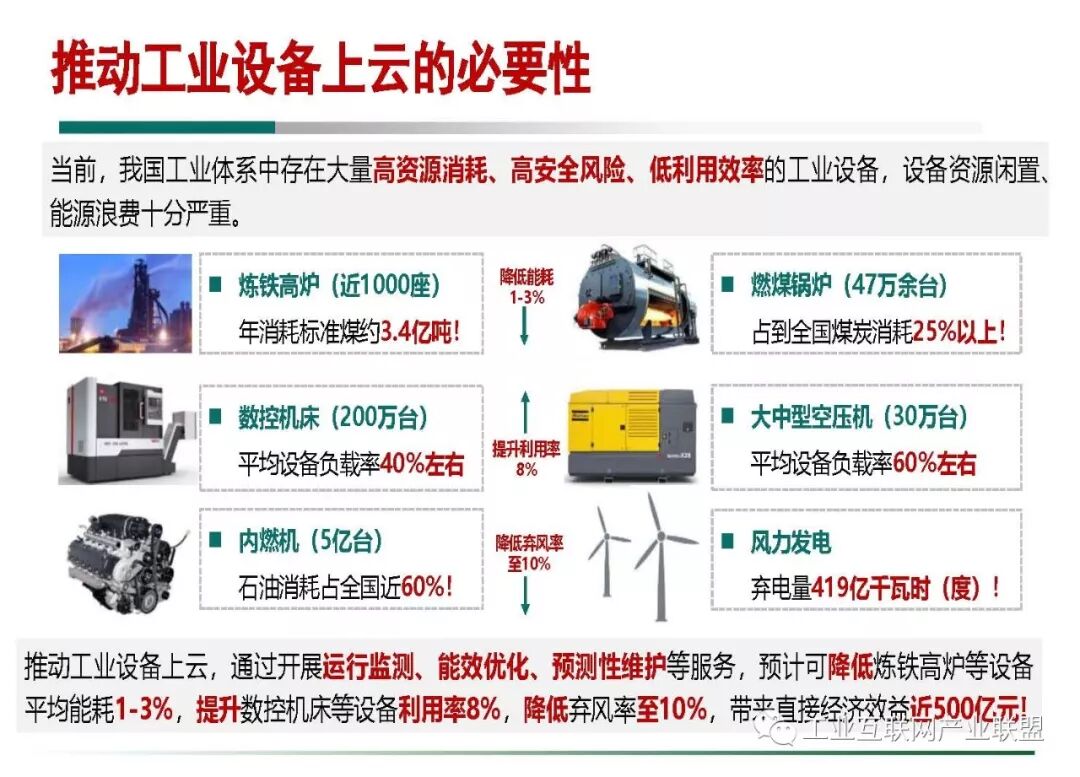 当前,我国工业体系中存在大量高资源消耗、高安全风险、低利用效率的工业设备。根据相关行业协会专家初步测算,2017年,我国近1000座炼铁高炉年消耗标准煤约3.4亿吨, 47万余台燃煤锅炉能耗占到全国煤炭消耗25%以上,5亿台内燃机石油消耗占全国石油消耗近60%,30万台大中型空压机、200万台数控机床平均设备负载率分别不足60%和40%,风力发电弃电量为419亿千瓦时,设备资源闲置、能源浪费十分严重。推动炼铁高炉、工业锅炉、数控机床等工业设备上云,通过开展运行监测、能效优化、预测性维护等服务,预计可降低炼铁高炉等设备平均能耗3%,提升数控机床等设备利用率8%,降低风电设备弃风率至10%。