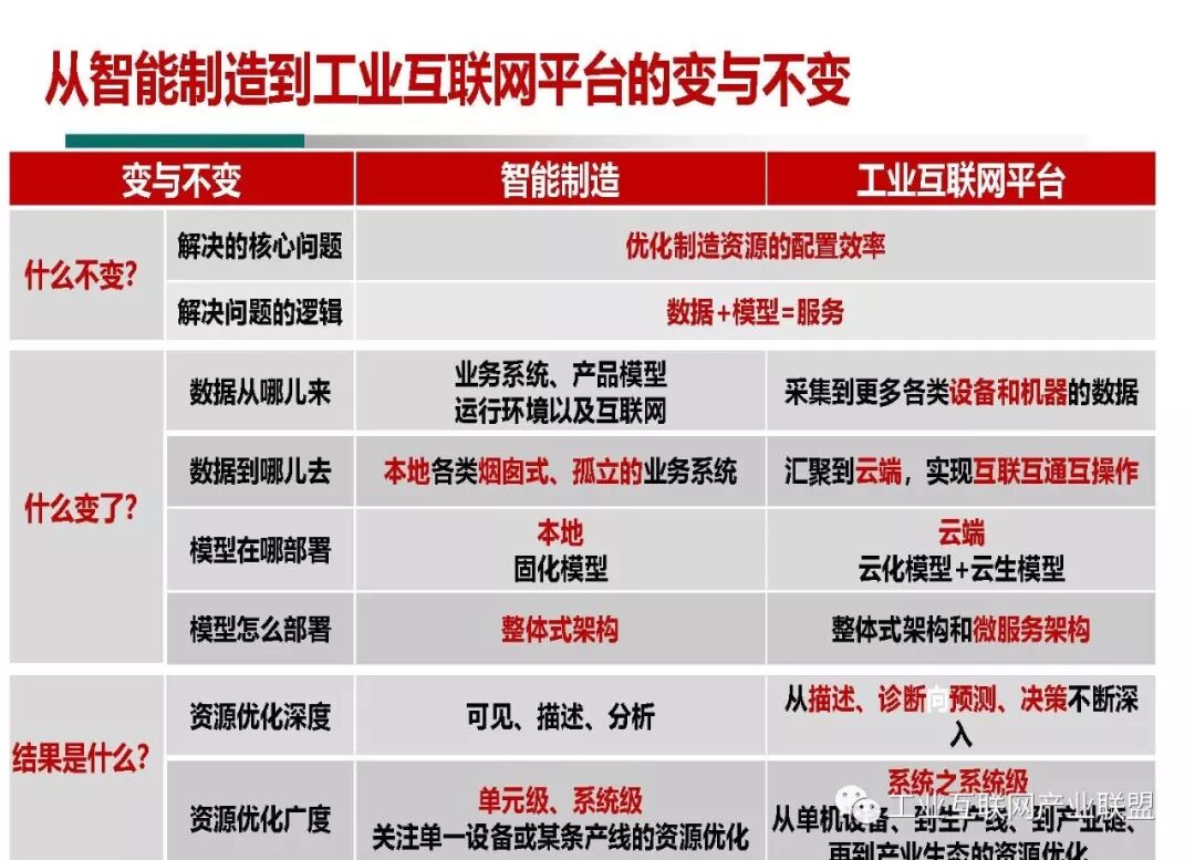 要解决的核心问题没变。无论是两化融合、智能制造,还是工业互联网平台,都在考虑如何提高制造业产品质量、生产效率、服务水平、降低成本,这些问题是十年前、二十年前、三十年前就存在的老问题。制造企业面临这些问题可以转化为如何提高资源配置效率,制造业竞争的本质是资源配置效率的竞争,两化融合、智能制造、工业互联网平台的出发点和落脚点都是考虑如何优化制造资源的配置效率。