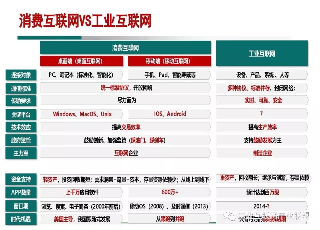在资金支持上,消费互联网是轻资产,对存量资源的依赖比较少,其发展方向是从线上走到线下,而工业互联网是重资产,不仅仅强调创新,而且强调与已有资源的继承、创新和线上线下的协同。