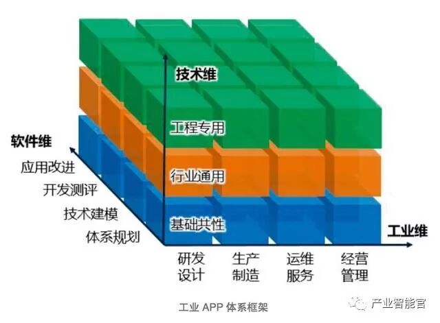 工业 APP 体系框架是一个三维体系,包含了工业维、技术维和软件维三个维度。三个维度彼此呼应,和谐地构成和体现了“工业·技术·软件(化)”的工作主旨。