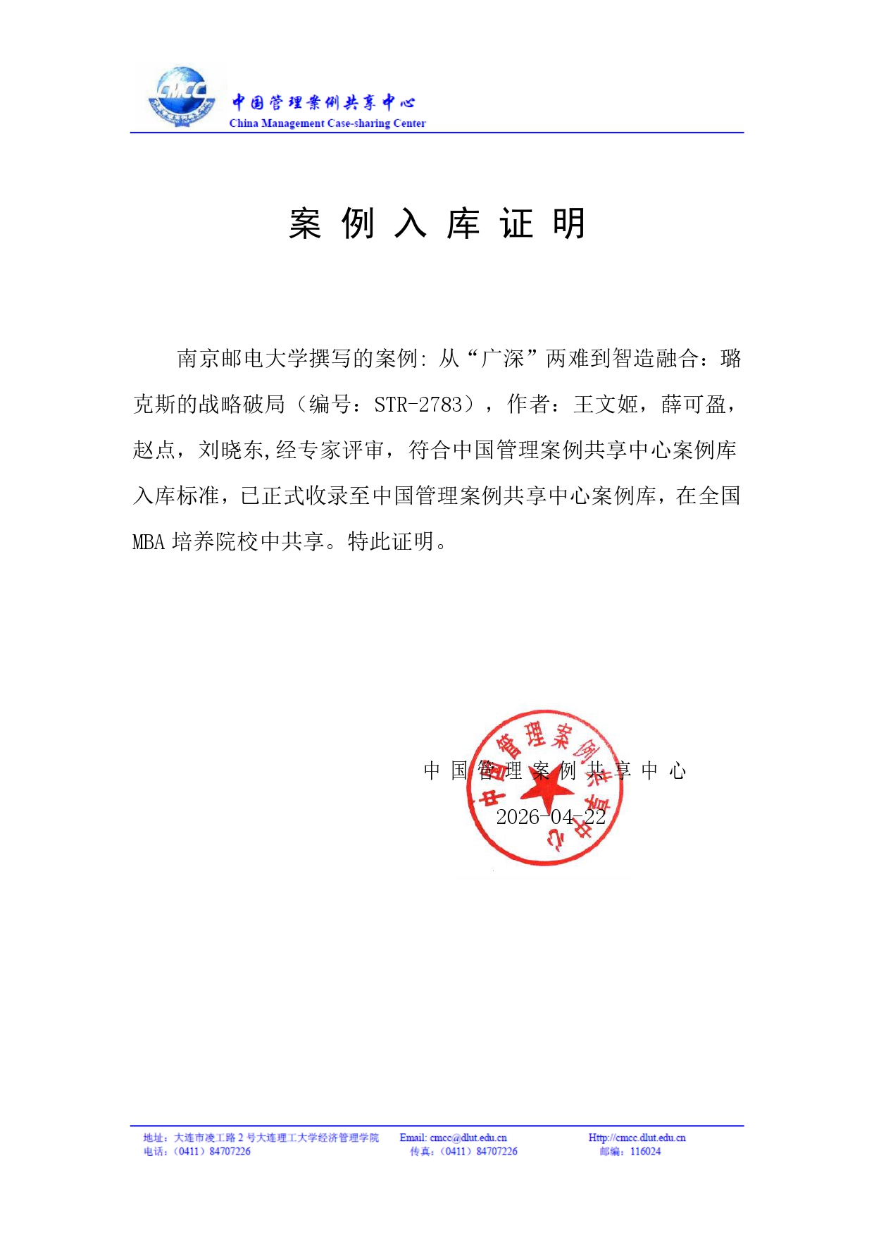 近日,从中国管理案例共享中心传来喜讯:由璐克斯集团董事长、AI智造网创始人刘晓东与南京邮电大学管理学院王文姬、薛可盈、赵点联合撰写的教学案例《从“广深”两难到智造融合:璐克斯的战略破局》(编号:STR-2783),经专家评审符合入库标准,已正式收录至中国管理案例共享中心案例库,将在全国MBA培养院校中共享使用。